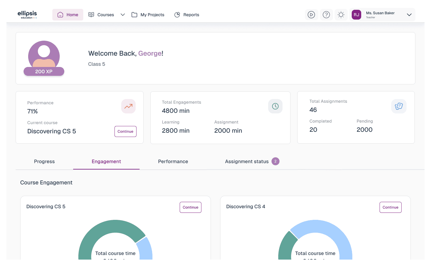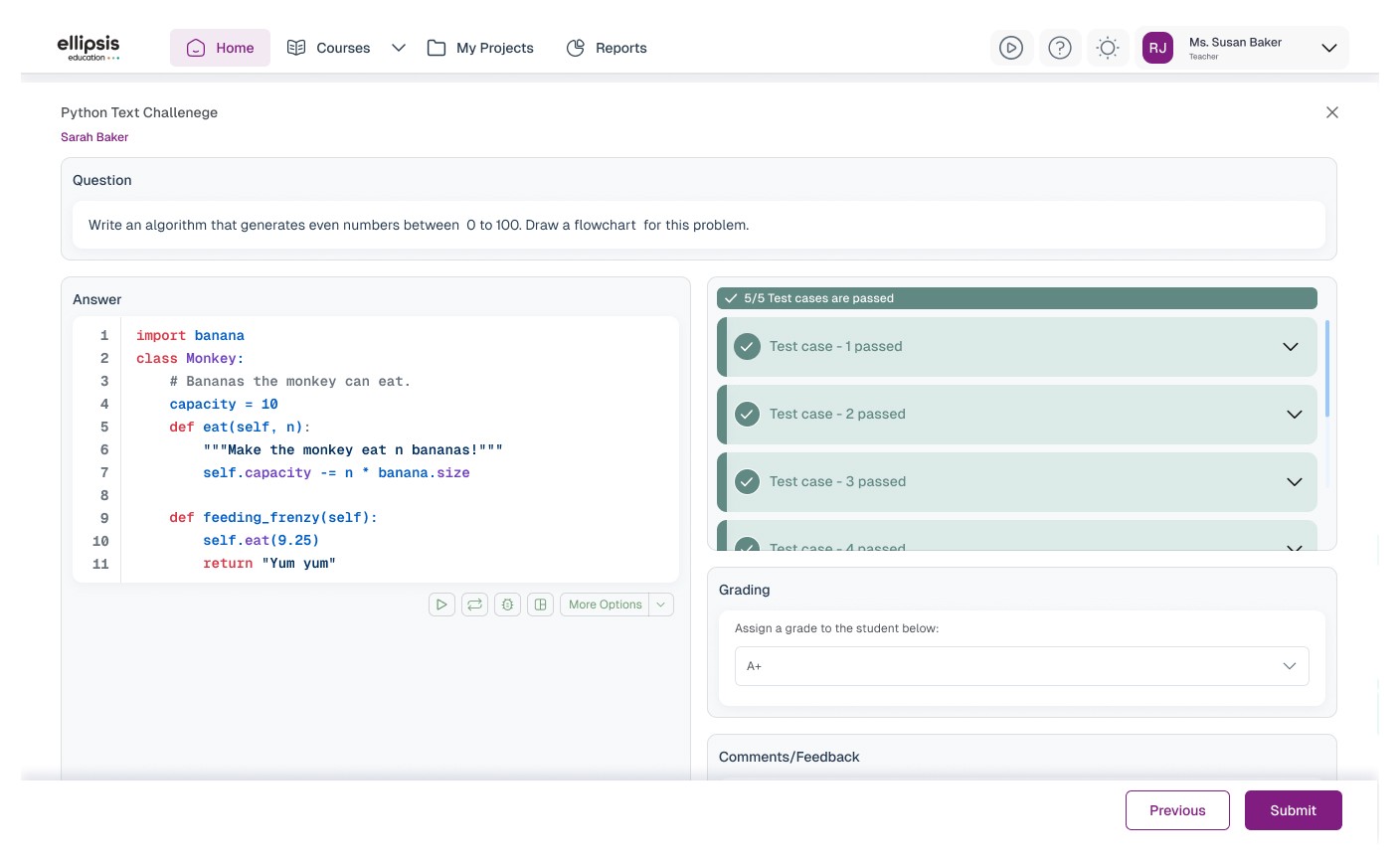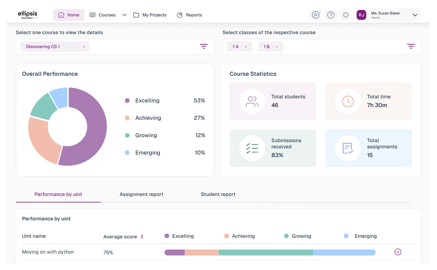 Ellipsis courses are delivered through the Ellipsis learning platform, designed to support high-quality, teacher-led computer science instruction. The platform brings together curriculum, assessment, and student activities in one place—making it easier for teachers to facilitate instruction and for students to engage meaningfully with computer science content.