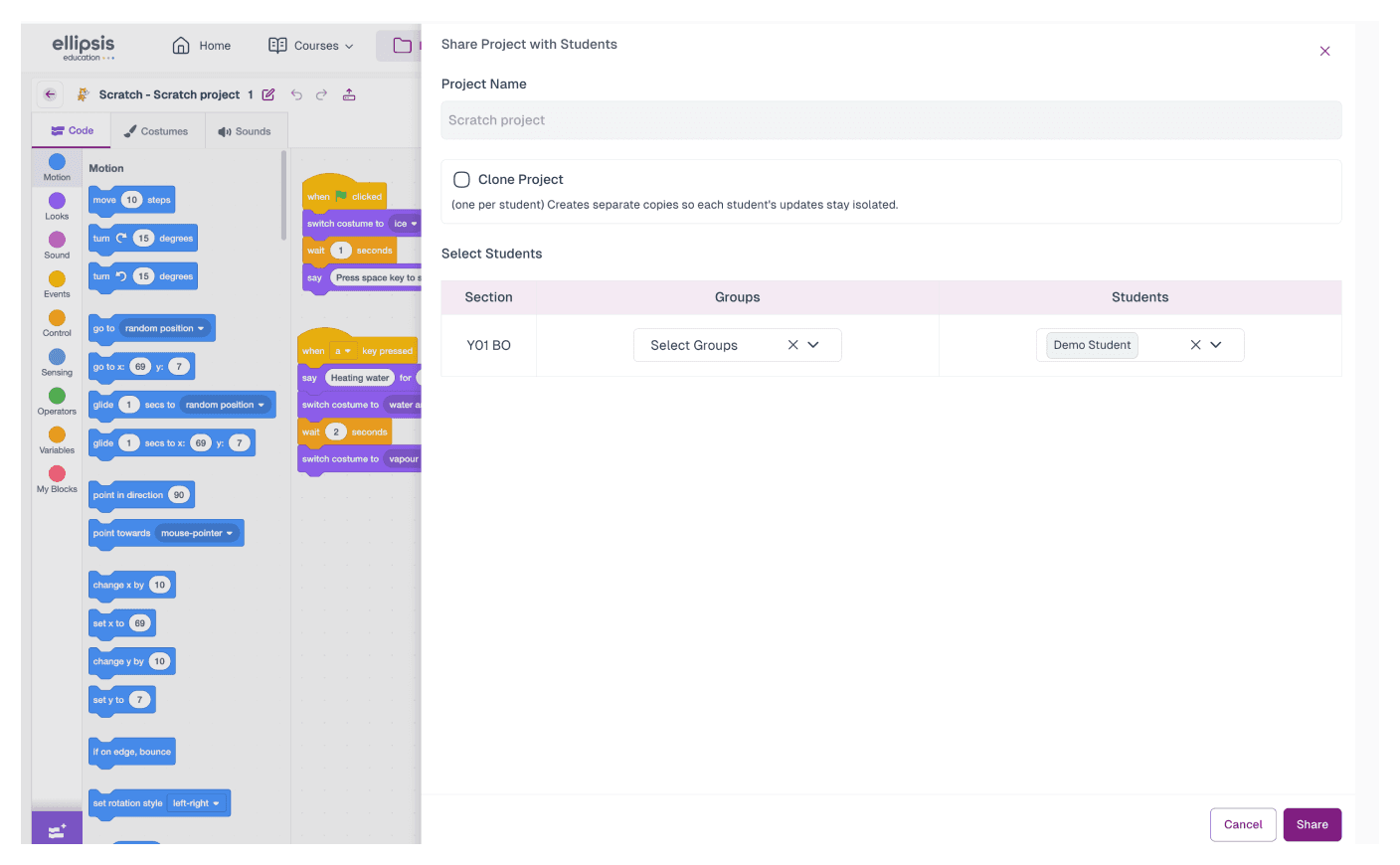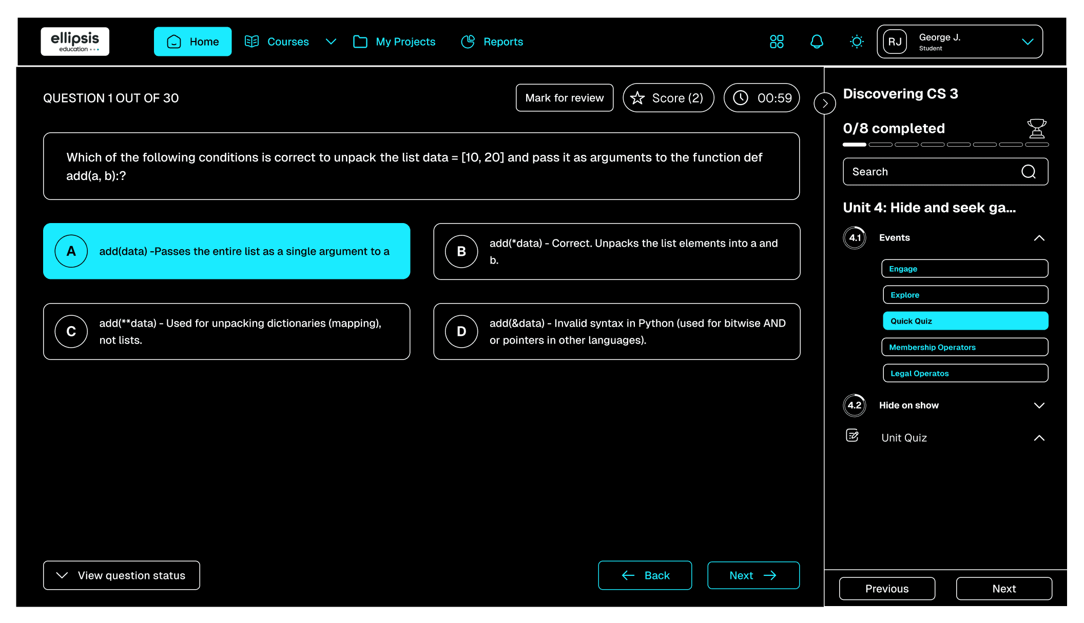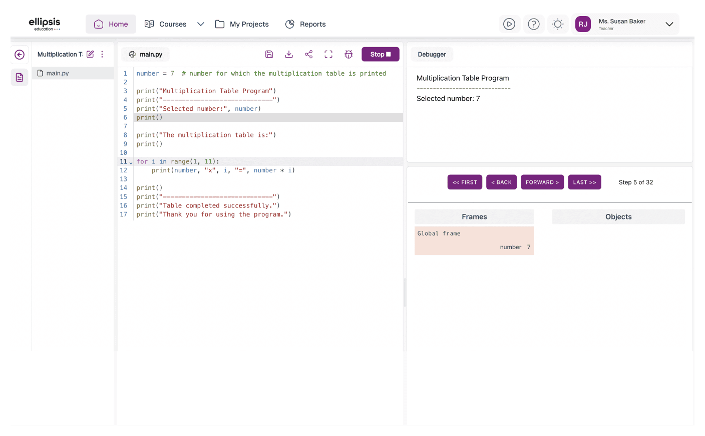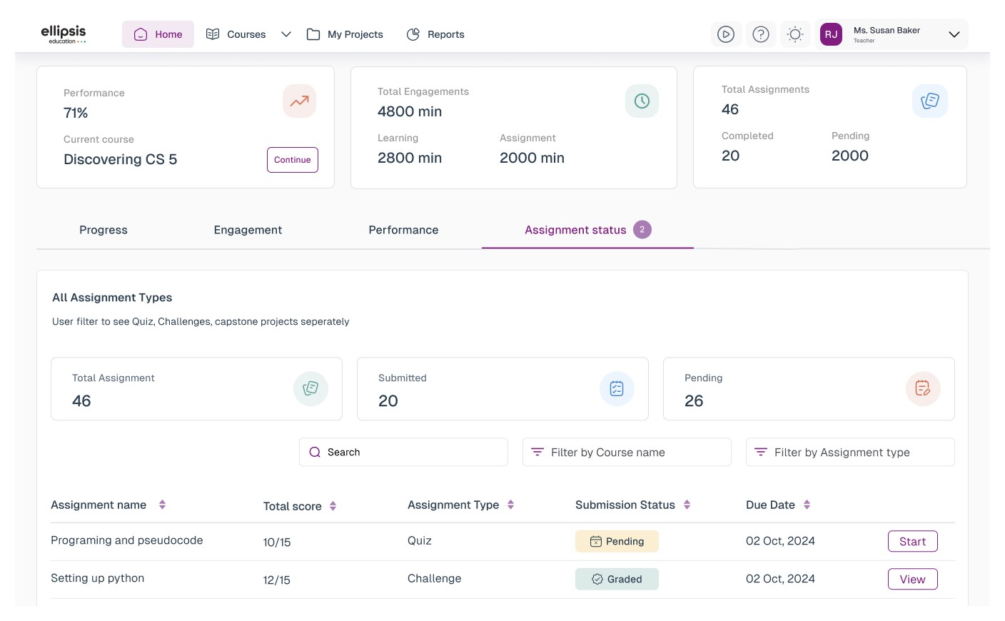 Ellipsis courses are delivered through the Ellipsis learning platform, designed to support high-quality, teacher-led computer science instruction. The platform brings together curriculum, assessment, and student activities in one place—making it easier for teachers to facilitate instruction and for students to engage meaningfully with computer science content.