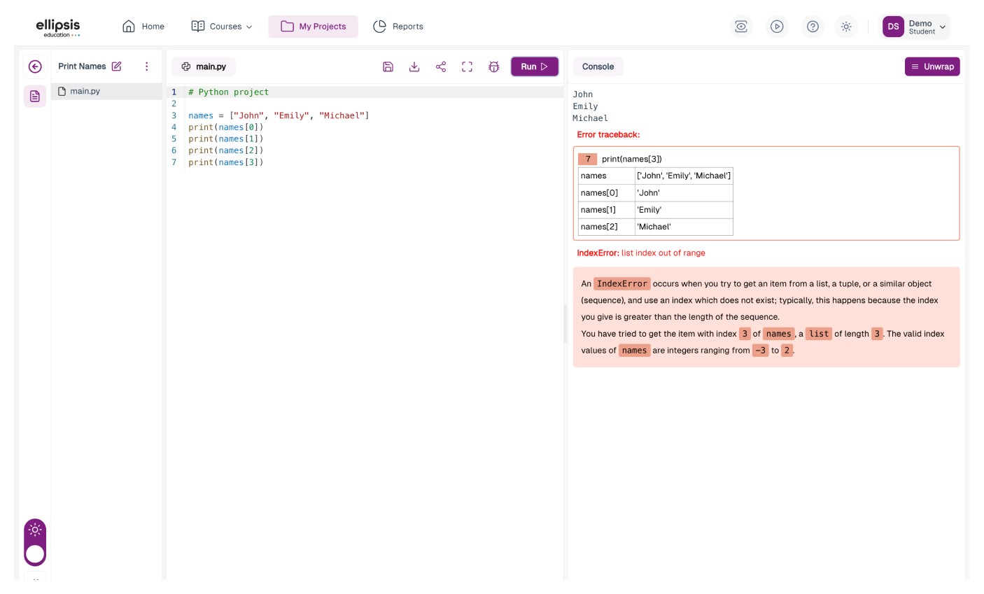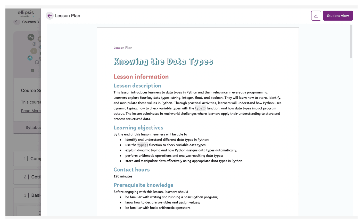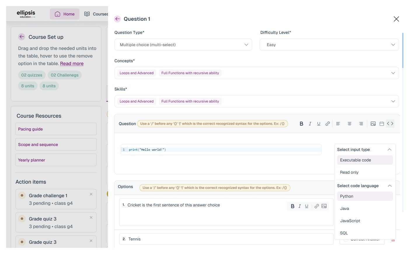 Unlike platforms that require teachers to build lessons from scratch, Ellipsis provides educators with everything they need to teach confidently. The platform augments Ellipsis’ comprehensive teacher-facing resources while giving students a secure, structured environment to complete quizzes, challenges, and coding projects.